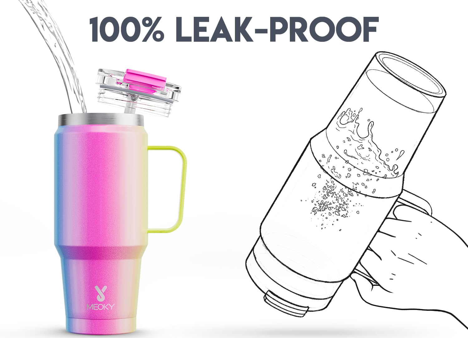 - ENJOY 2X. With DUO 2-in-1 & 100% leak-proof lid, Meoky tumbler with handle and straw allows you to flip the straw lid to drink iced coffee and the sip lid to taste hot tea.