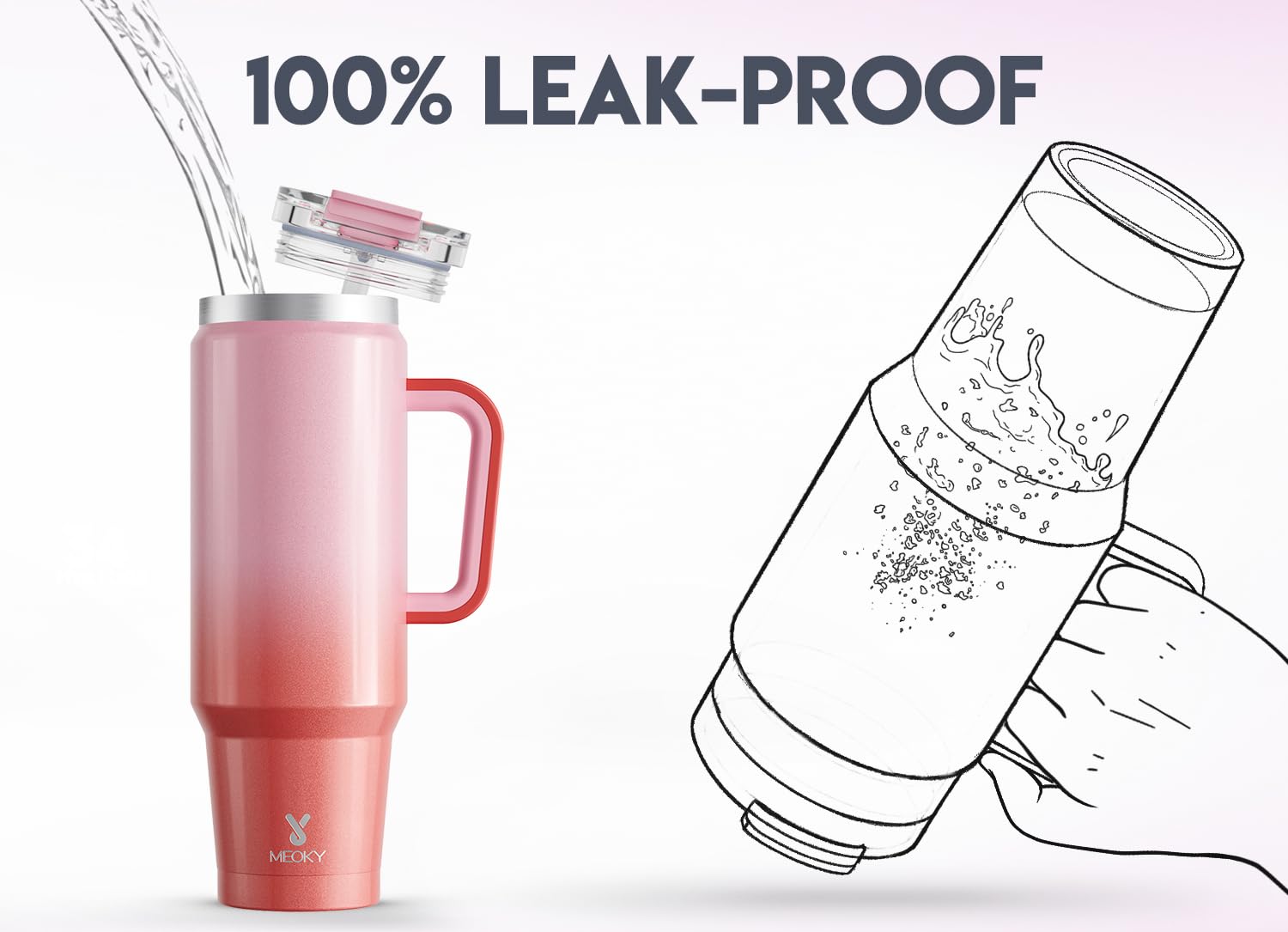 - KEEPS COLD. With double-wall vacuum insulation, Meoky 40 oz tumbler with handle and straw stays cold for 34 hours and hot for 10 hours.
